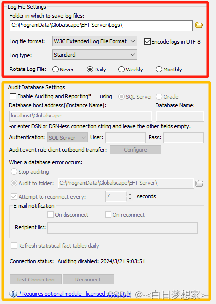 这里显示了文件存放位置,滚动日志文件有时间项可选,关于数据库选项默认未开启,开启后,可对数据库类型进行选择配置。