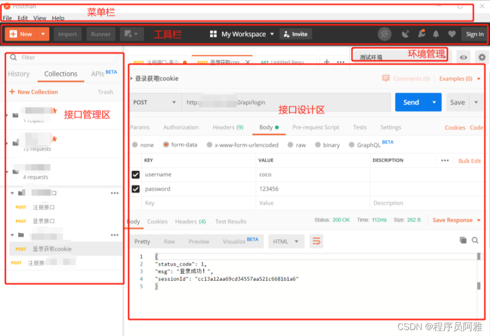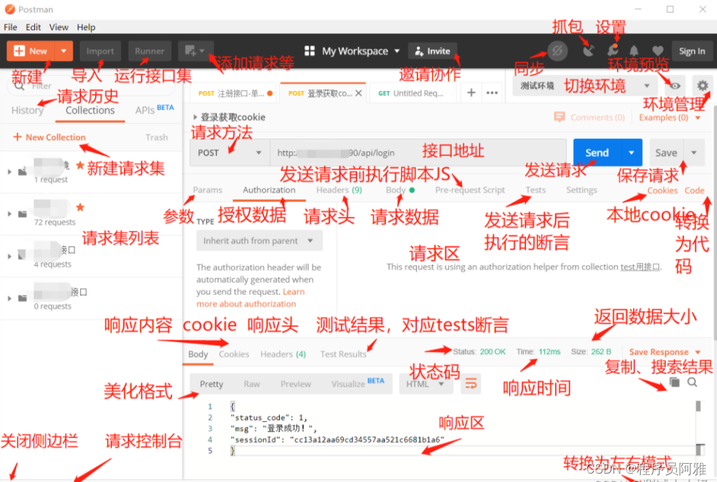 Collections: 接口集,相当于一个接口项目或测试计划,接口集中可以建立无限极子文件夹,用于对接口进行分组管理