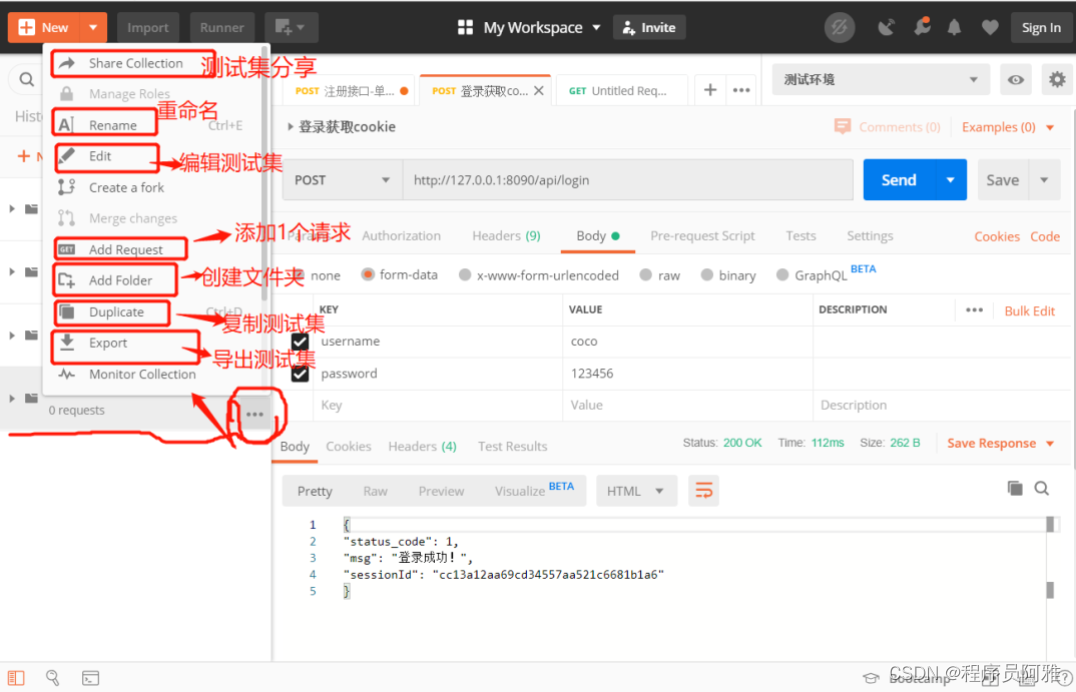 ①新建一个Collection,比如课堂练习,新建请求(add requests)如登录,选择POST方法,填入URL,请求数据,URL的host使用配置的环境变量,请求数据使用变量做参数化,本地新建参数化文件备用