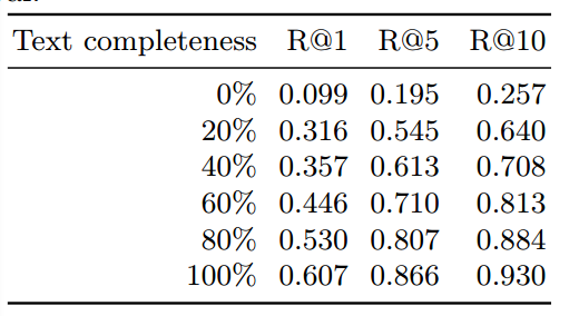 表3显示了每个文本完备程度的结果检索召回率。我们观察到,与不提供文本查询作为输入(0%)相比,当只包含20%的令牌时,recall@1从0.099增加到0.316。随着更多的标记物的加入,回忆的增加会减少。