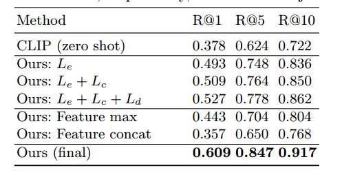 表1比较了我们的方法的Recall@{1, 5, 10}和当前基于文本的图像检索的最先进的方法
