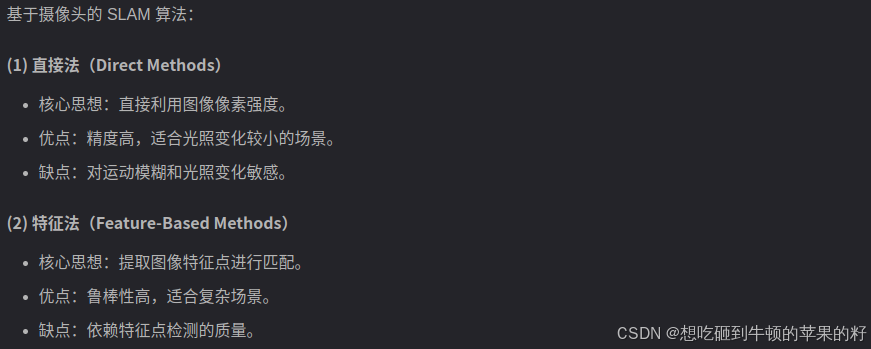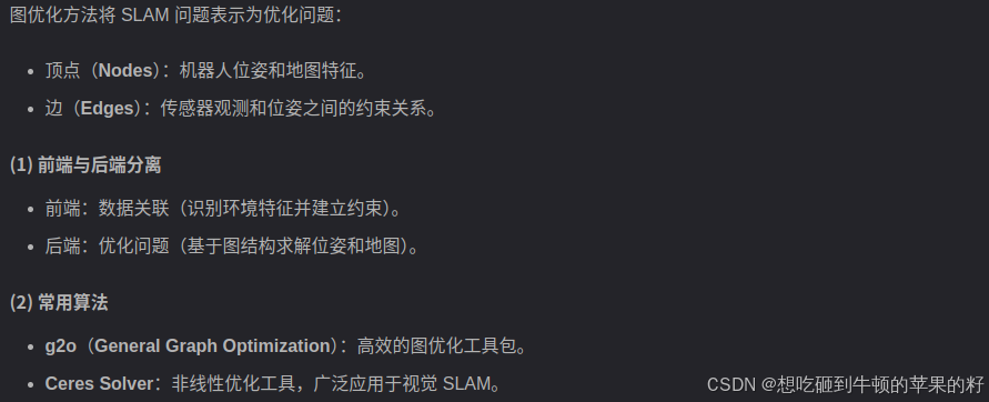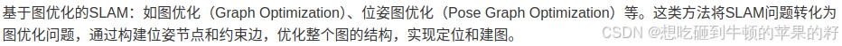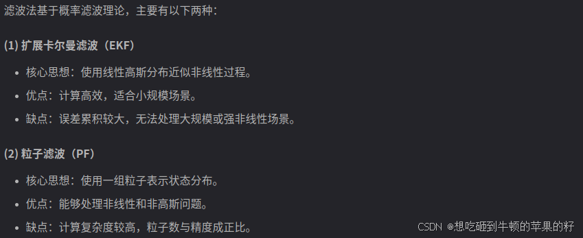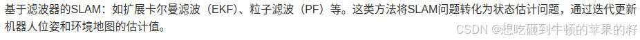 如:EKF-SLAM(1987)扩展卡尔曼滤波器(EKF)、FastSLAM(2002)粒子滤波器、