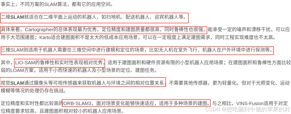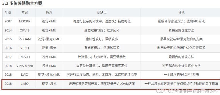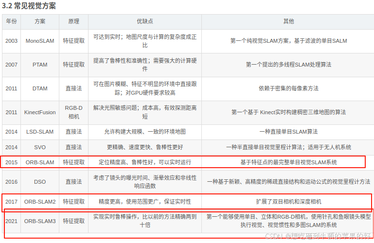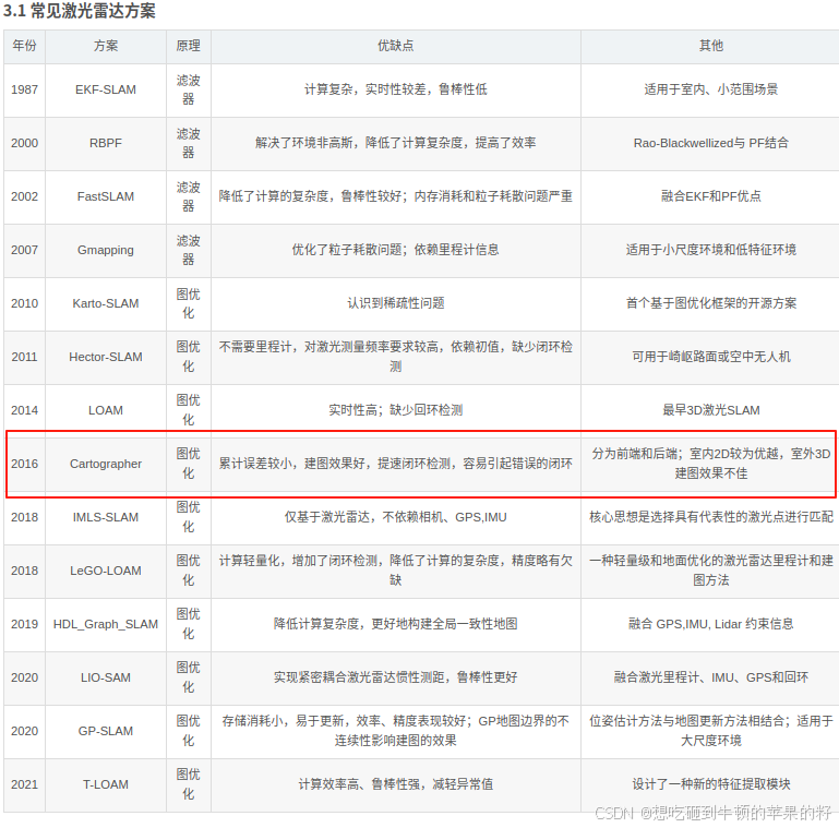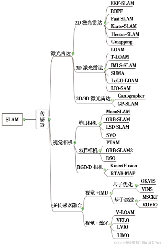 如:T-LOAM(2021)、ORB-SLAM3(2021经典)是一种基于特征点的视觉SLAM算法、DynaSLAM、LSD-SLAM(2014)、DSO(2016)、 VINS-Mono(2018)、SVO(2014)、Cartegrapher(2016经典)