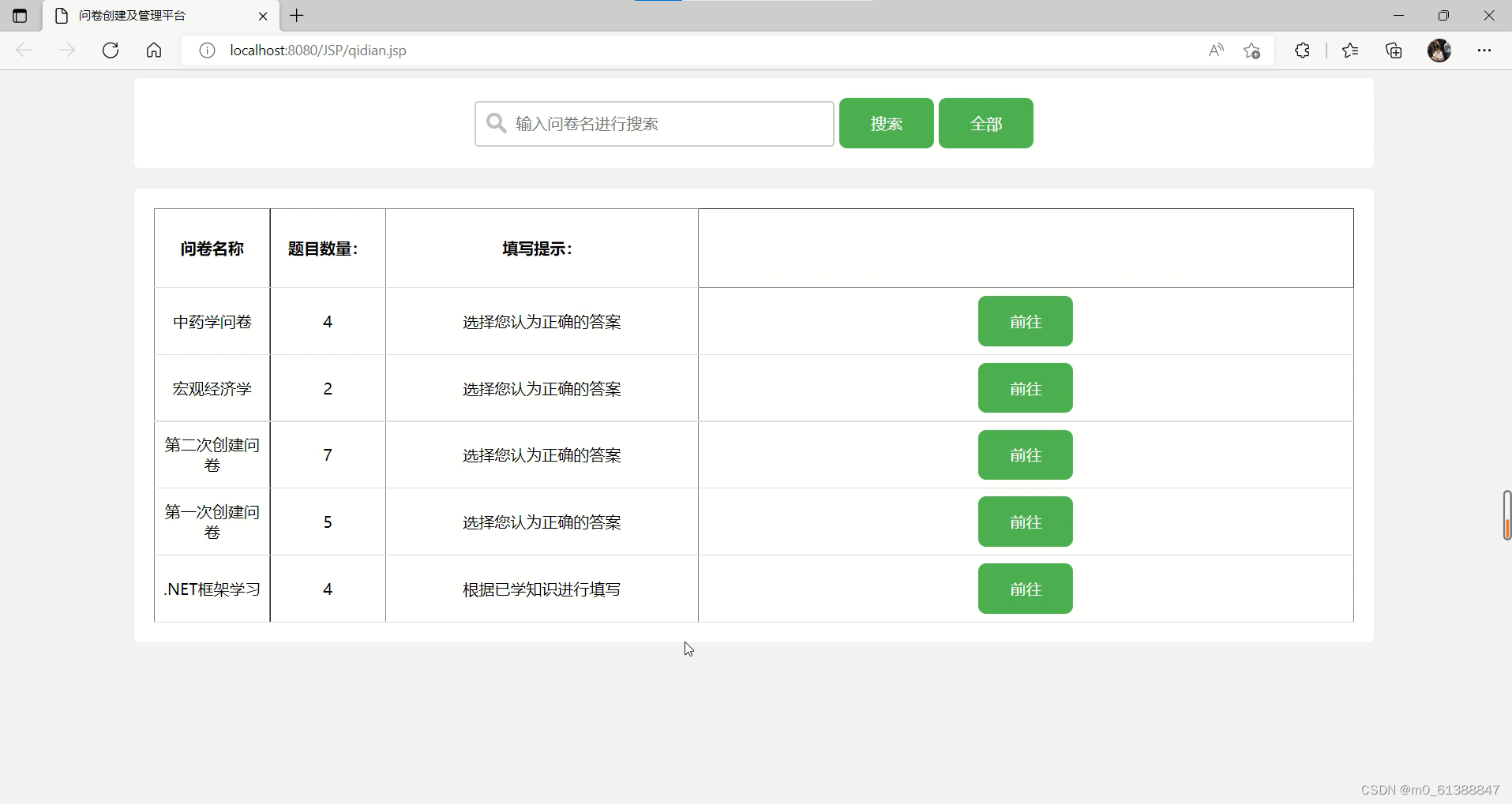 使用JSP实现问卷调查及管理系统,实现功能:登录注册、数据库增删改查、用户搜索问卷、用户填写问卷、管理员查看提交问卷、管理员修改问卷、管理员创建问卷等等