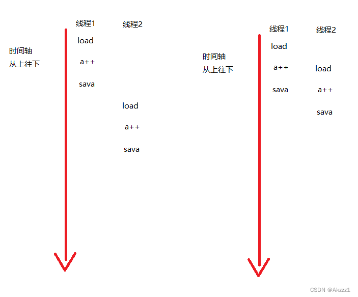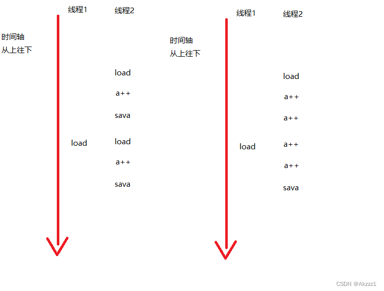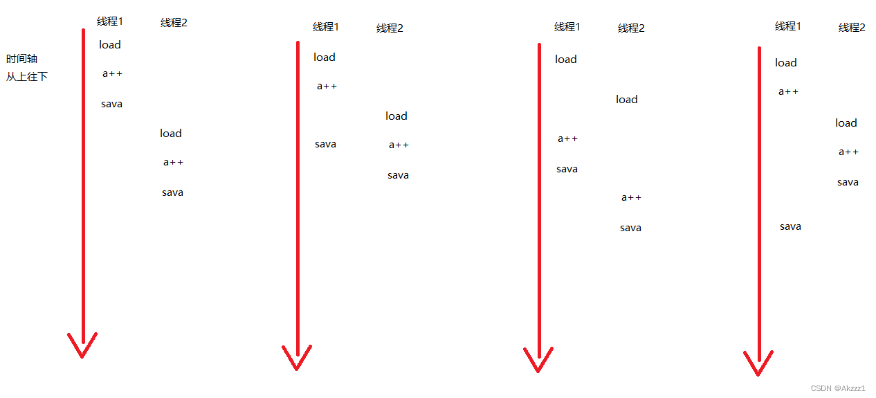 2.多个线程修改同一个变量,注意,这里是同一个变量,通过上面这个图我们看的出来,当线程1在读一个数据的时候,线程2也可能读了原本的数据。在线程1保存之后,线程2还是修改的原来读的值,再进行保存,然后就会覆盖掉线程1修改的值,所以我们本来期望a这个变量是自增两次,但是到最后只自增了一次,与预期结果不符。多线程修改同一个变量这是我们可以改变的,只要我们不修改同一个变量,那每个线程自己干自己的事情,就不会导致线程不安全。