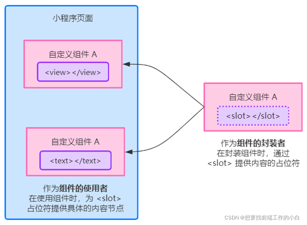 1、插槽:在自定义组件的 wxml 结构中,可以提供一个 <slot> 节点(插槽),用于承载组件使用者提供的 wxml 结构。