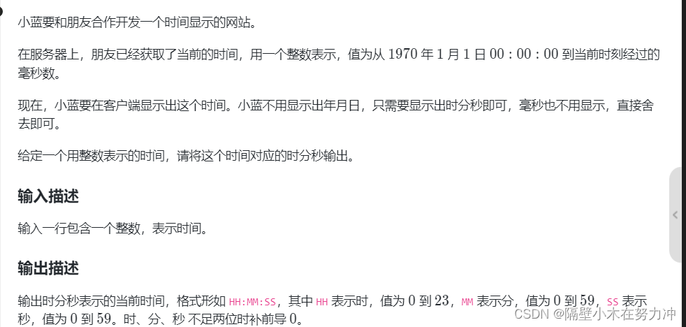 蓝桥杯PythonB组备考 思路: 首先引入datetime模块,先把微妙化为秒(整除1000),然后分别计算出当前时分 秒,最后格式化输出,其实直接输出d的结果也是和格式化输出结果一样,但是要是 换成别的格式,就得留意。strftime:将时间对象格式化为字符串 f---format help(time.strftime) time.strftime("%Y-%m-%d")list1 用于存放杨辉三角,list2用于存放行,list用于存放数字。