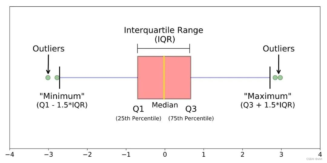 利用箱型图的四分位距(IQR)对异常值进行检测,四分位距(IQR)就是上四分位与下四分位的差值。而我们通过IQR的1.5倍为标准,规定:超过上四分位+1.5倍IQR距离,或者下四分位-1.5倍IQR距离的点为异常值。