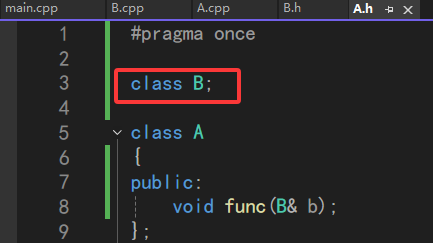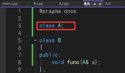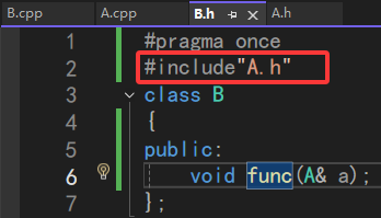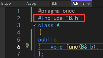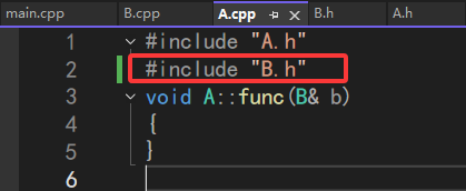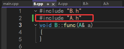 step2:在A、B类的cpp文件中相互包含,如图3-1和图3-2所示。
