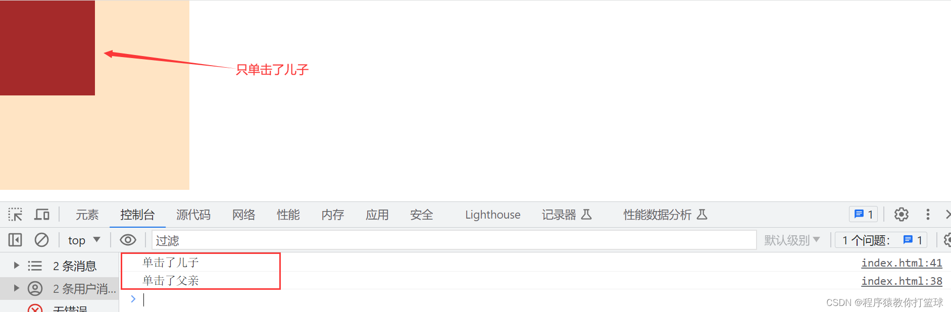 如下面这段代码,给父容器加上点击事件,子容器加上点击事件,然后单击子容器:
