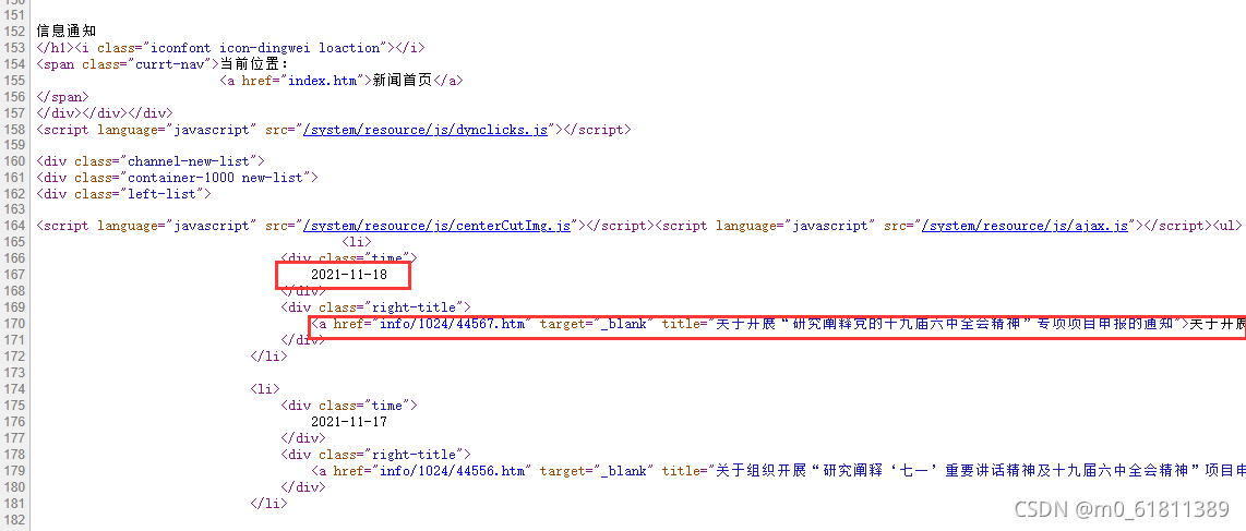 1.分析网页源代码http://news.cqjtu.edu.cn/xxtz.htm,查看全部通知通知发出的时间和通知的标题