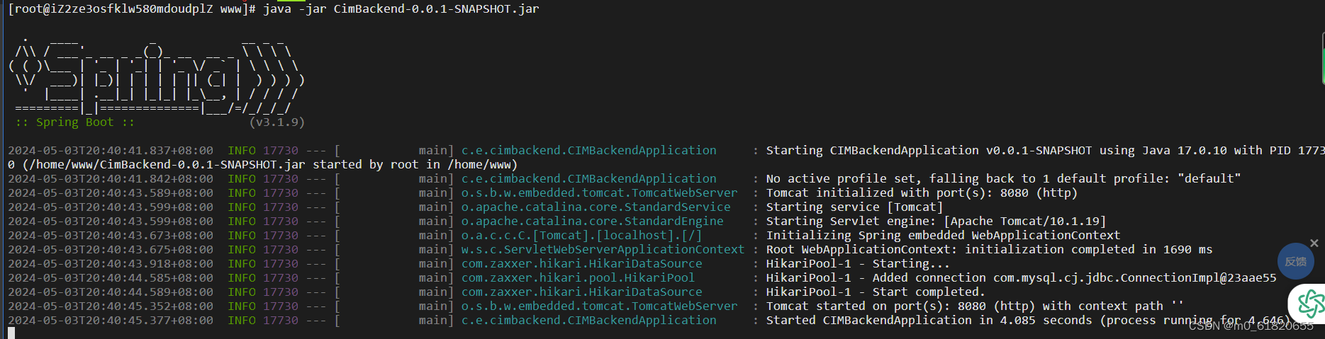 如果出现反馈内容,证明jar包运行成功,项目已经在服务器上跑起来了