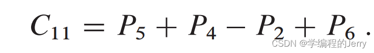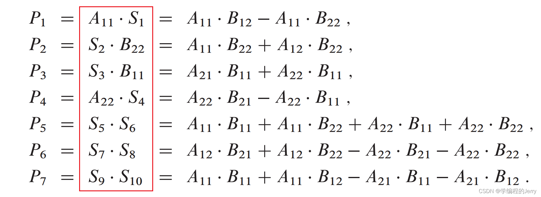 ③用步骤1中创建的子矩阵和步骤2中创建的10个矩阵,递归地计算7个矩阵积P1,P2...P7,且每个矩阵Pi都是n/2*n/2的。7个矩阵计算方式如下,我们只需要算红框部分就行了。