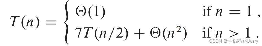 n=1时,只需θ(1)的时间;n>1时,步骤1、2、4均花费θ(n²)的时间,步骤3进行了7次n/2*n/2矩阵的乘法,时间为7T(n/2),加起来从而得到