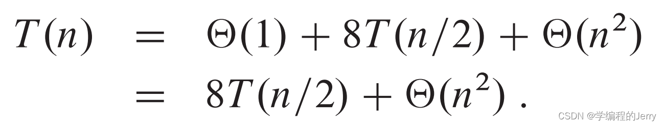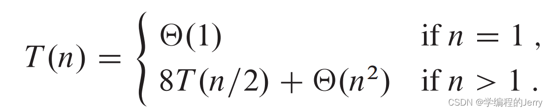 ②n>1,使用下标分解矩阵花费Θ(1)时间;8次递归,每次递归需要调用完成两个n/2*n/2矩阵的乘法,因此花费的时间为8T(n/2)