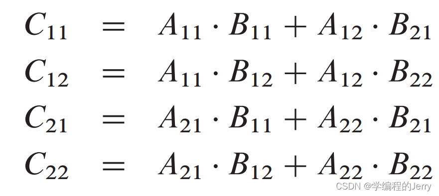 ①将输入矩阵A、B和C分解成n/2*n/2的子矩阵。采用下标计算法,这个步骤花费θ(1)的时间,与SQUARE-MATRIX-MULTIPLY-RECURSIVE相同。