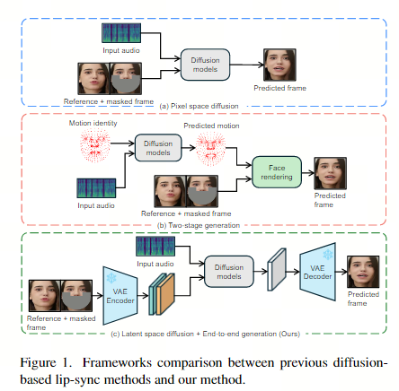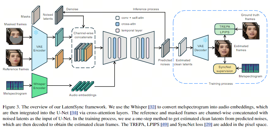 这是一种基于音频条件潜在扩散模型的新型端到端口型同步框架,无需任何中间 3D 表示或 2D 标志。LatentSync 利用稳定扩散SD强大的生成能力直接捕捉复杂的视听相关性,从而生成动态逼真的说话视频(图1 c)。