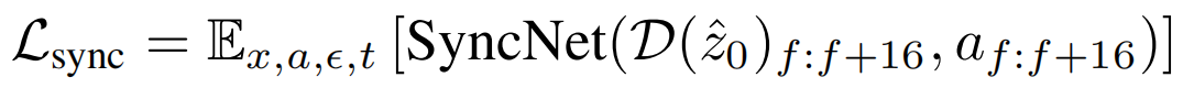 第二阶段,我们使用解码像素空间的监督方法添加 SyncNet 损失。我们将 SyncNet 的输入帧长度增加到16。通过使用 16 个解码的视频帧和相应的音频序列,SyncNet 损失可以公式化为: