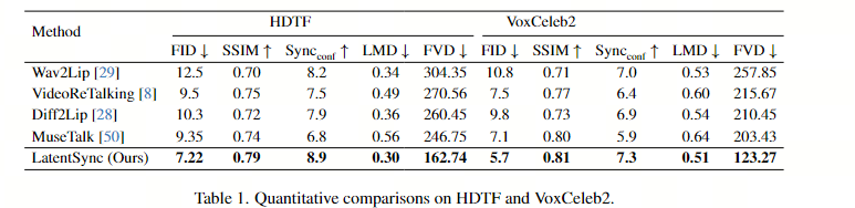 时间层向 U-Net 添加了时间自注意层,以增强时间一致性。我们最初尝试将时间层应用于 LatentSync,但发现它严重损害了口型同步准确性。相比之下,我们的 TREPA 不仅避免损害口型同步准确性,甚至在一定程度上提高了口型同步准确性。我们假设这是因为时间层向 U-Net 添加了额外的参数,导致反向传播中的一些梯度分布到时间层参数上,削弱了音频交叉注意层参数的学习。另一方面,TREPA 不添加额外的参数;为了提高时间一致性,模型必须更有效地依赖音频窗口中的信息(因为我们知道口型同步模型使用音频窗口来捕获时间信息)。因此,音频交叉注意层得到了进一步的训练和加强。另一个有趣的发现是,TREPA 还可以用于提高 Wav2Lip的时间一致性和口型同步准确性。理论上,任何一次生成多个连续帧的视频生成模型都可以利用 TREPA 来增强时间一致性。