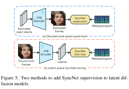 模型在噪声空间中进行预测,而 SyncNet 需要图像空间中的输入。为了解决这个问题,使用预测的噪声一步估计。另一个问题是模型在潜在空间中进行预测。文章探索了两种将 SyncNet 监督添加到潜在扩散模型中的方法:(a) 解码像素空间监督,以与wav2lip相同的方式训练 SyncNet。(b) 潜在空间监督,需要在潜在空间中训练 SyncNet。此 SyncNet 的视觉编码器输入是通过 VAE编码获得的潜在向量。发现与在像素空间中训练相比,在潜在空间中训练 SyncNet 的收敛性更差。推测这是由于 VAE 编码过程中唇部区域的信息丢失造成的。潜在空间 SyncNet 的收敛性较差也导致监督扩散模型的音频唇部同步准确度较差。因此,在 LatentSync 框架中使用解码像素空间监督。