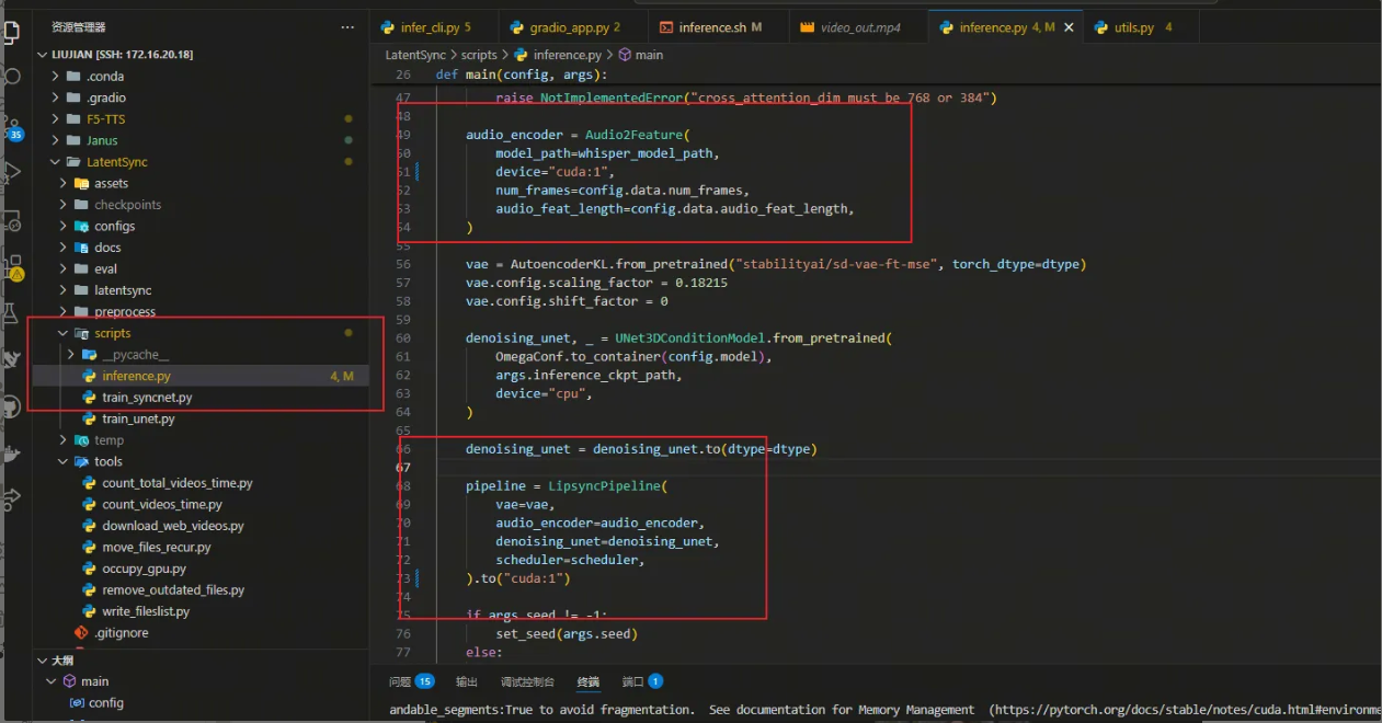 如果显卡被占用可以修改inferenc.py文件,这里我用的是cuda:1,如下