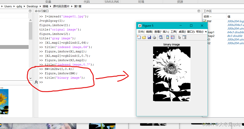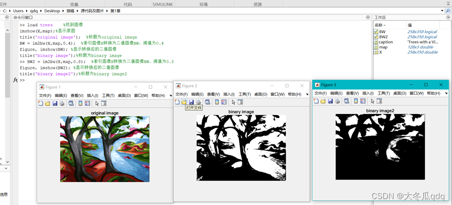 - BW=im2bw(X,map,level) :将颜色映射图为图map的索引图像X转化为二值图像。Level:阈值,取值在0~1之间。Level的值越大,图像质量越差。