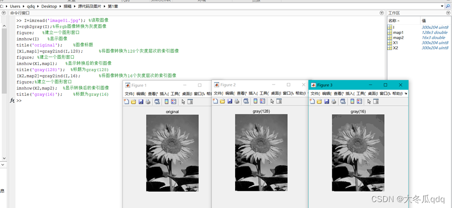 - 9)[X,map] = gray2ind(I,n)或[X,map]= gray2ind(BW,n):将灰度图像I或二值图BW转换为索引图像X,n是灰度级。