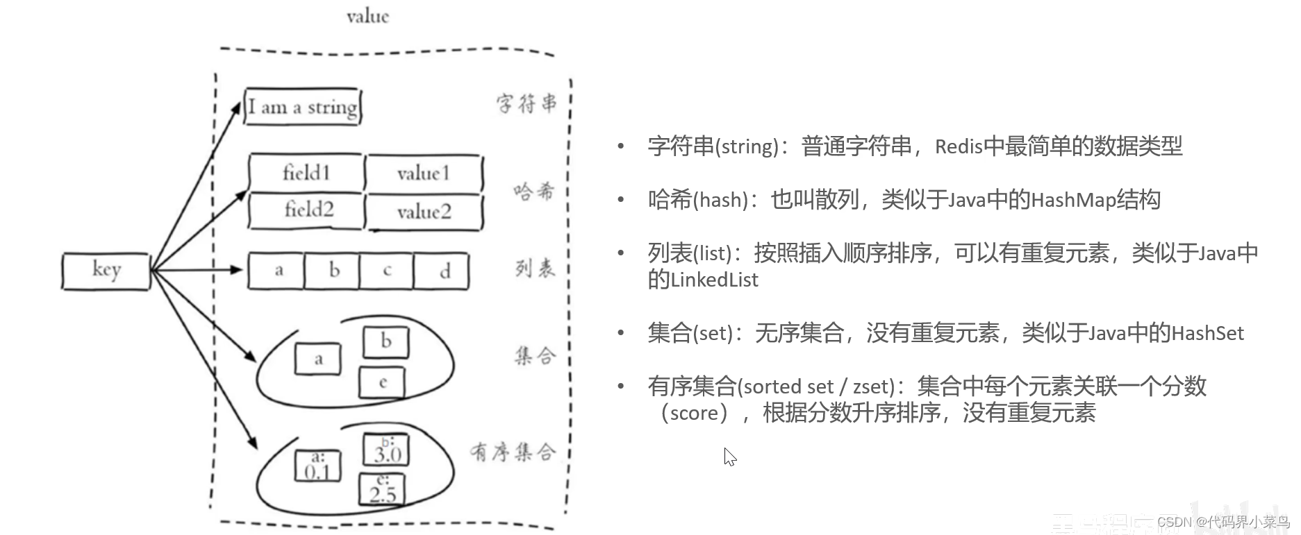 字符串 string、哈希 hash、列表 list、集合 set、有序集合 sorted set / zset