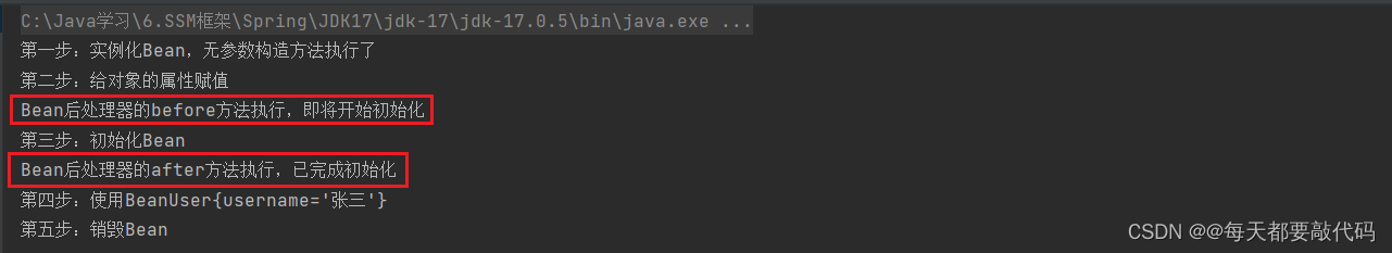 (1)在以上的5步中,第3步是初始化Bean,如果你还想在初始化前和初始化后添加代码,可以加入“Bean后处理器”;需要编写一个类实现BeanPostproccessor接口,并重写里面的befor和after方法。
