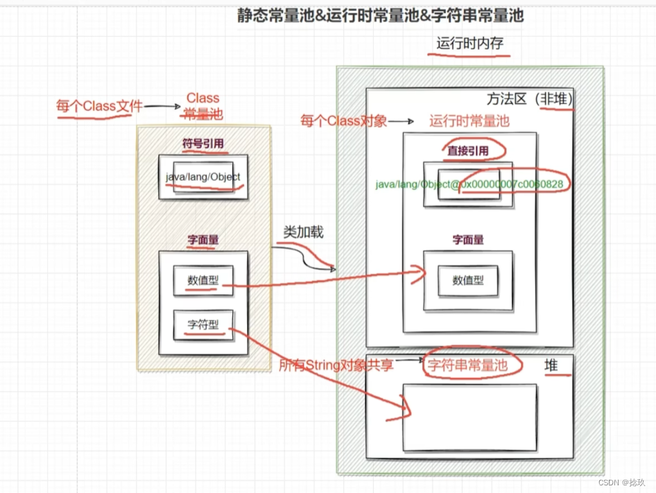 String,StringBuffer, StringBuilder 全局字符串常量池class文件常量池运行时常量池。我们现在所说的就是全局字符串常量池,对这个想弄明白的同学可以看这篇Java中几种常量池的区分。jvm为了提升性能和减少内存开销,避免字符的重复创建,其维护了一块特殊的内存空间,即字符串池,当需要使用字符串时,先去字符串池中查看该字符串是否已经存在,如果存在,则可以直接使用,如果不存在,初始化,并将该字符串放入字符串常量池中。字符串常量池的位置也是随着jdk版本的不同而位置不同。在jdk6中,常量池的位置在永久代(方法区)中,此时常量池中存储的是对象。