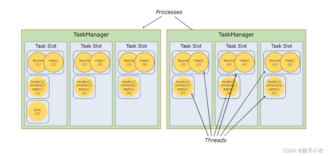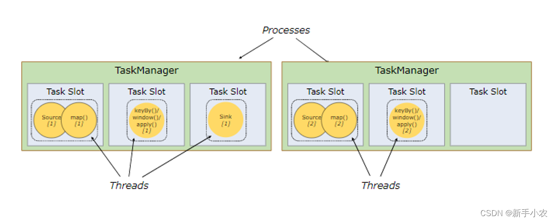 Flink是一个分布式流处理框架,它基于TaskManager和Slot来实现任务的执行。TaskManager是Flink中负责运行任务的工作进程,而Slot是TaskManager中可用的资源。