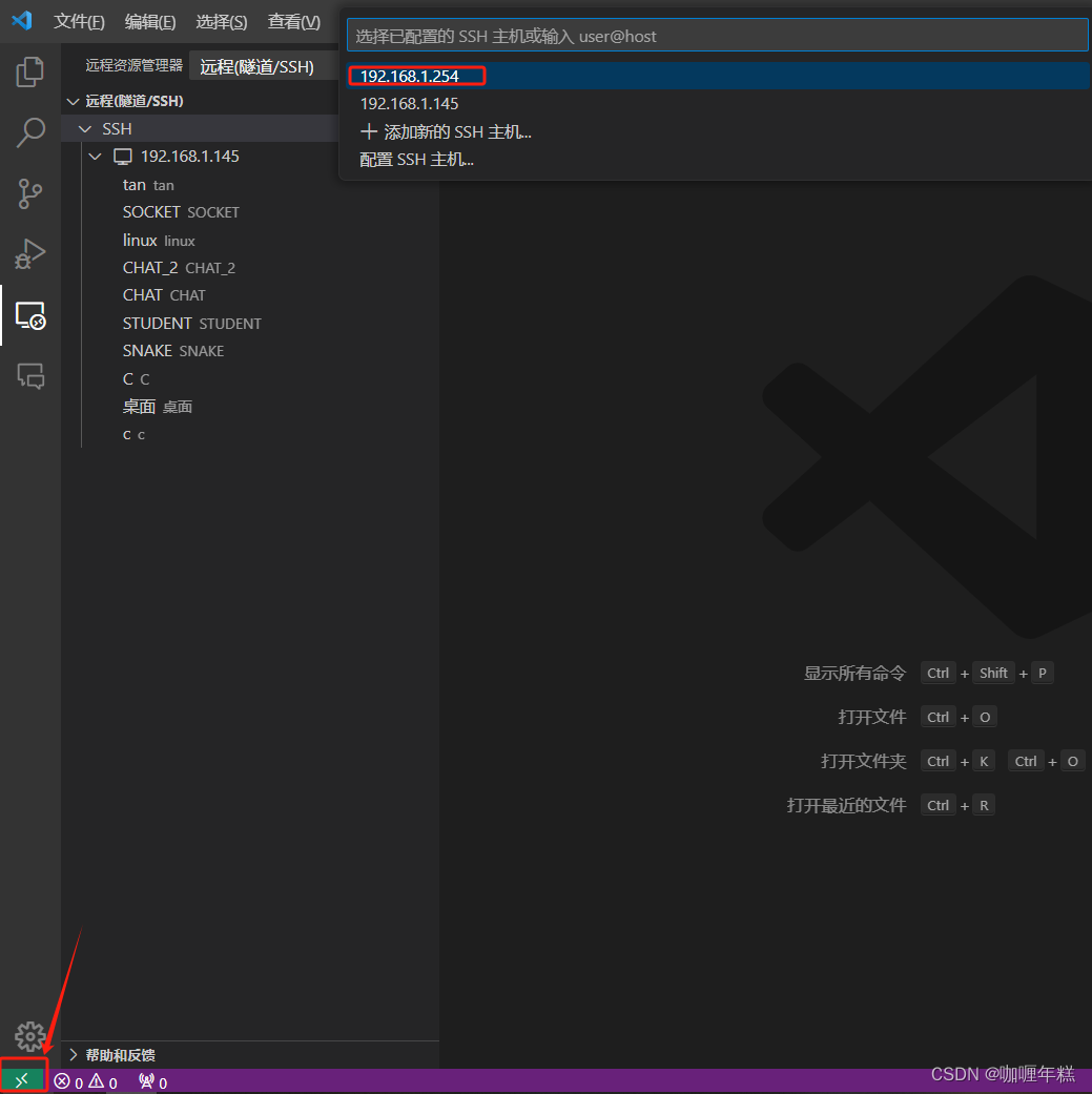 按F1或者 CTRL+SHIFT+P,输入Remote.ssh:Connect to Host 回车,点击 Configure SSH Host,再点击 c:/user/xxx/.ssh/config,这是会打开config文件