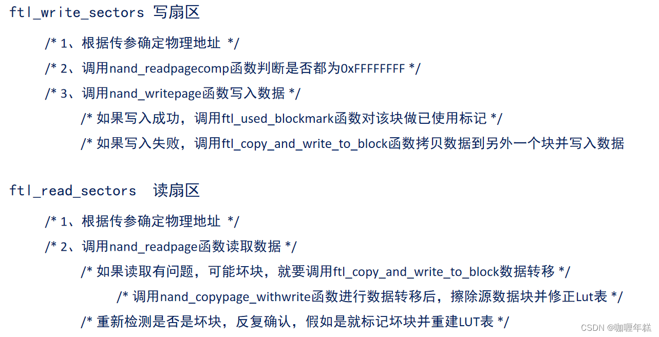 - 坏块识别:在 NAND Flash 制造过程中,由于工艺等原因,会产生一些不良块(坏块)。这些坏块无法正常读写,因此需要在使用前进行识别和标记。