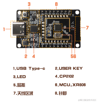 XR806_OpenHarmony开发板是基于XR806芯片设计开发的参考评估,板身集成了XR806芯片、WiFi/BT双天线、供电系统、按钮及LED等,并引出了所有可用引脚,可供开发者进行方案评估、DIY或小规模产品研发使用。以下为开发板外观图(更多硬件资料地址