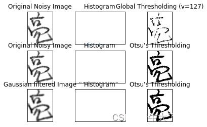titles = ['Original Noisy Image','Histogram','Global Thresholding (v=127)',
