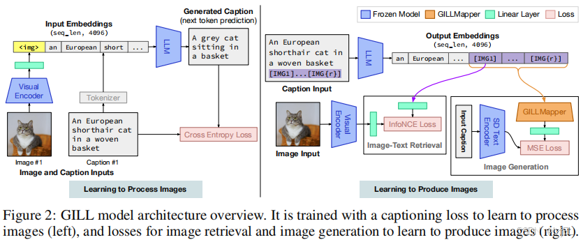 【分子材料发现】——GILL:使用多模态语言模型生成图像(论文简述) 论文提出了一种方法,通过映射。论文提出的模型展示了一系列多模态能力:图像检索、新颖图像生成和多模态对话。本方法首次能够根据任意交错的图像和文本输入来生成连贯的图像(和文本)输出。为了在图像生成上实现强大的性能,论文提出了一个高效的映射网络,将LLM与现成的文本到图像生成模型联系起来。这个==映射网络将文本的隐藏表示转换为视觉模型的嵌入空间,使我们能够利用LLM的强大文本表示来输出视觉内容。==论文提出的方法在处理更长、更复杂的语言任务上超越了基线生成模型。