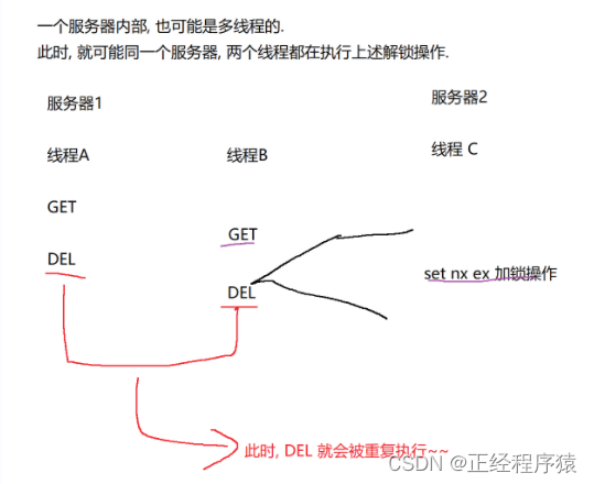 服务器2的线程C正好要执行加锁(set),此时由于A已经把锁释放了,C的加锁是能够成功的!!