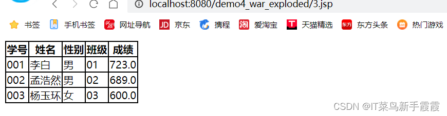 编写一个JAVA类和一个JSP页面,把下列信息封装到3个Student对象里,再把每个对象放到一个ArrayList对象里,再利用ArrayList对象在JSP页面的表格中显示下表所示的信息
