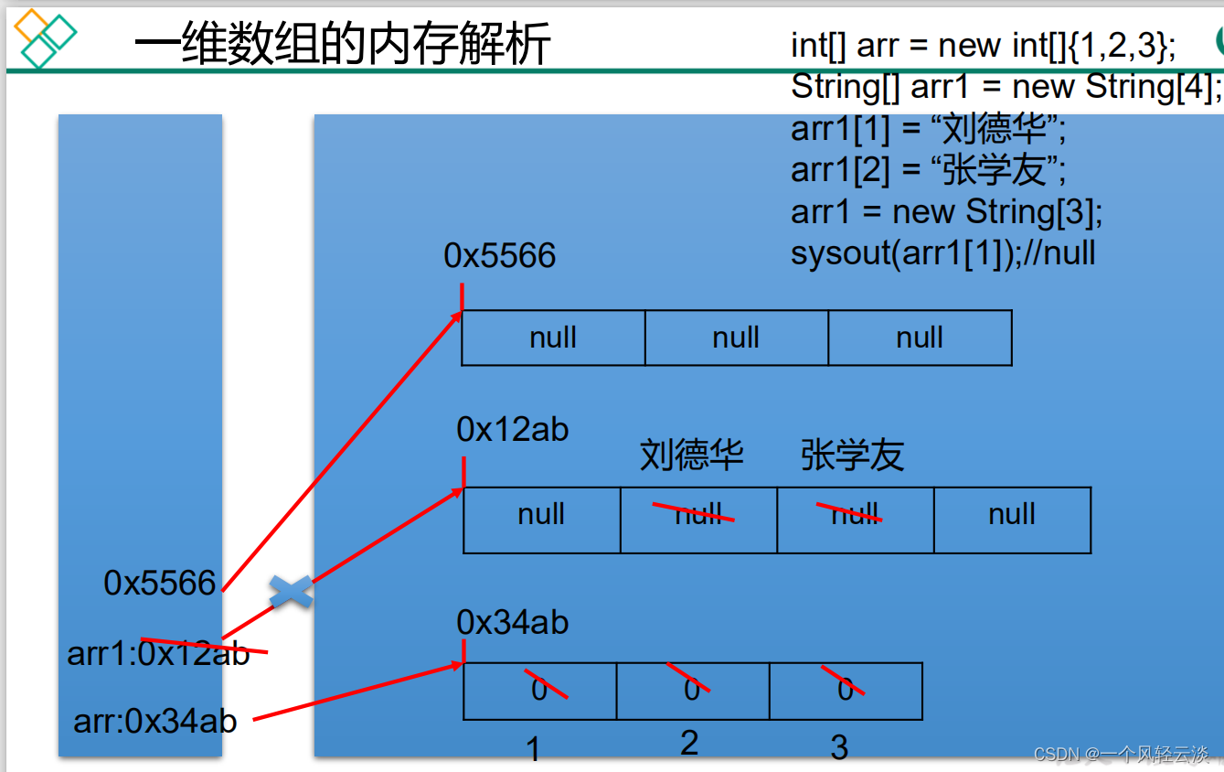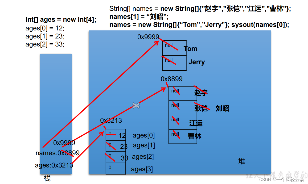 一个比较俗的玩意是什么?就是我们每new一个东西,给一个变量,该变量就会指向新new对象的地址!!!注意java和c语言不同,c语言中的数组名是不可变的,相当于一个常量指针;而java中的数组名就相当一个可以变化的指针,如果不理解,请看以下图示: