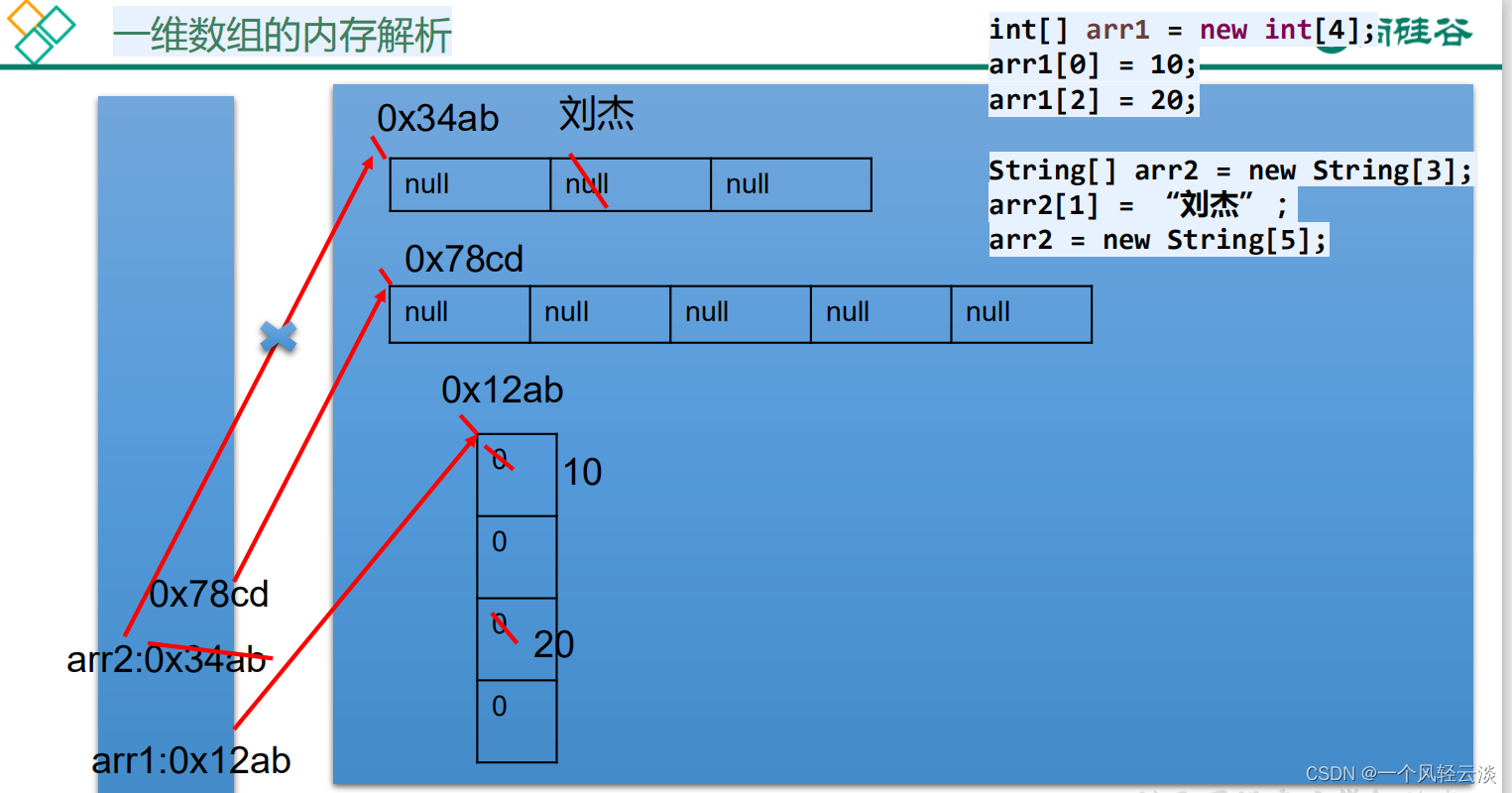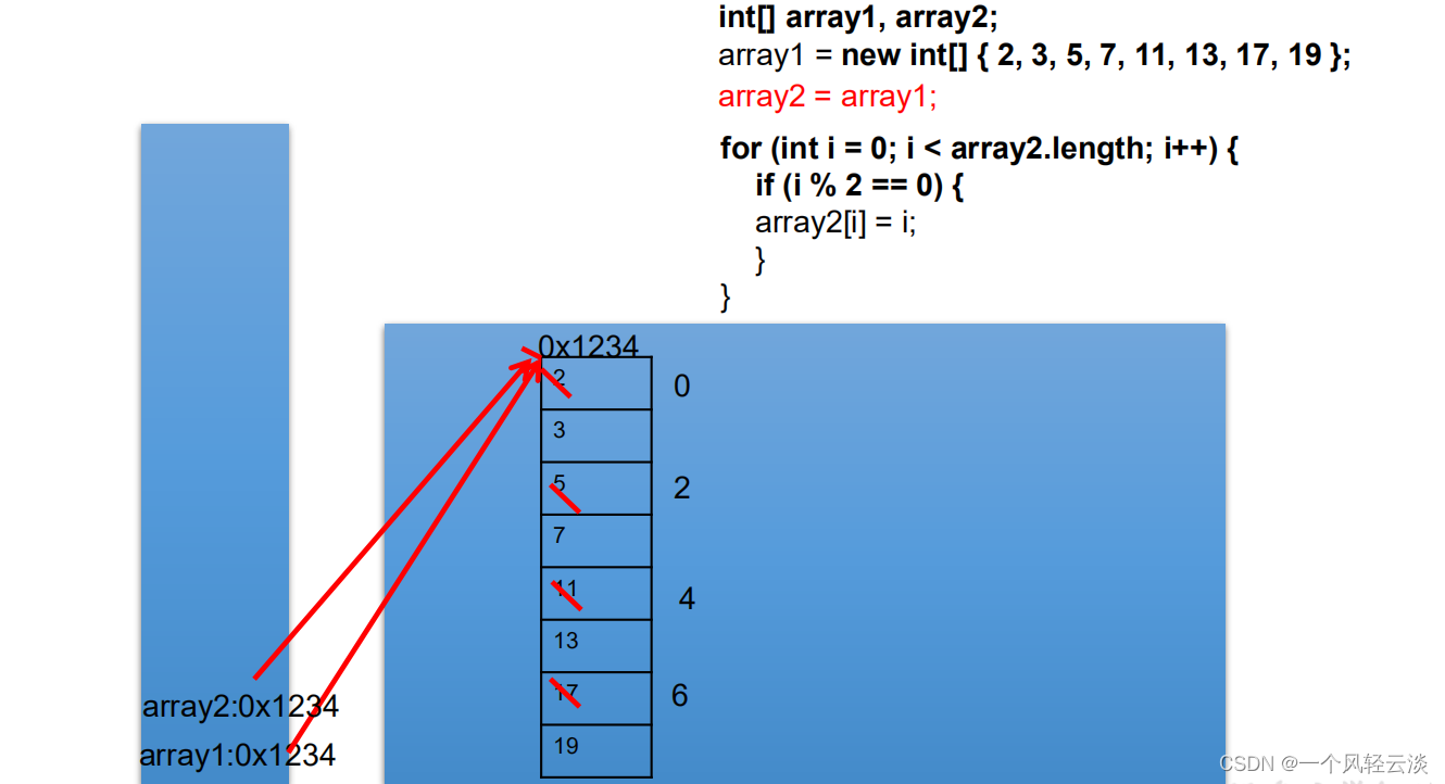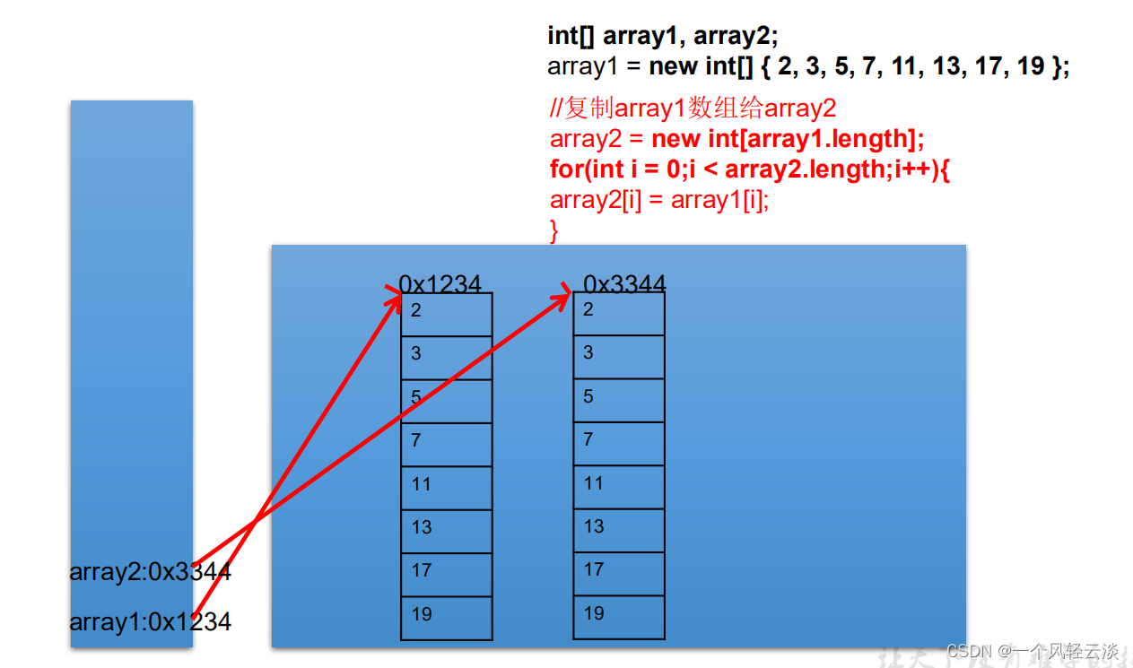 如下图我们定义了俩个数组,然后对arry1进行了new,而对arry2没有new,接着将arry1的值赋给了arry2,在这里我们需要的注意这里的赋值是地址赋值!!!即arry1和arry2指向了同一个空间!!!,共享内存!!!