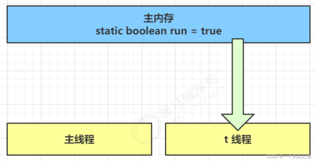 1. 初始状态, t 线程刚开始从主内存读取了 run 的值到工作内存。