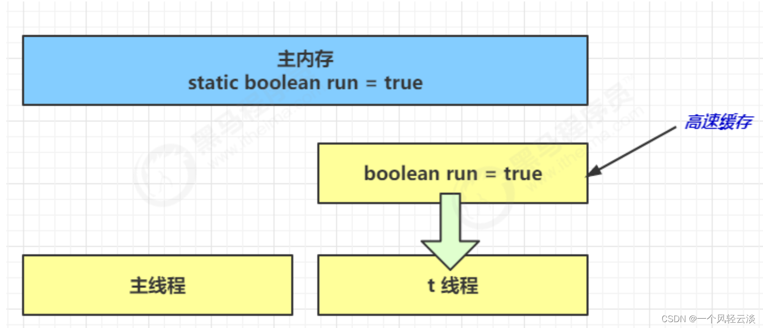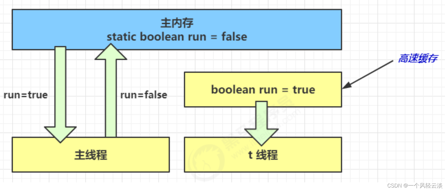 3. 1 秒之后,main 线程修改了 run 的值,并同步至主存,而 t 是从自己工作内存中的高速缓存中读取这个变量 的值,结果永远是旧值