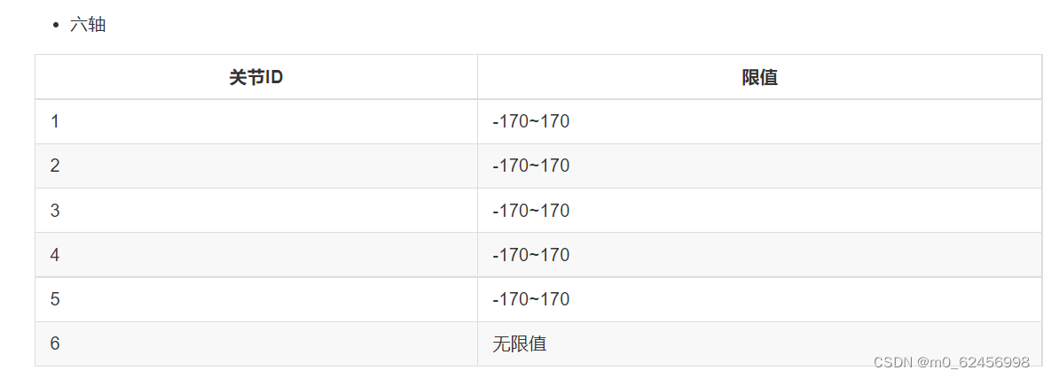 对于关节角度的取值范围:六轴机器人约-170 ~ 170,四轴机器人每个关节限值各不相同,详见上方表格图