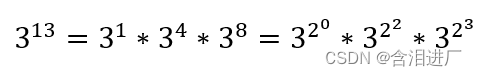 以3^13为例,13的二进制为1101,因此3的13次方可以分解成以下形式:
