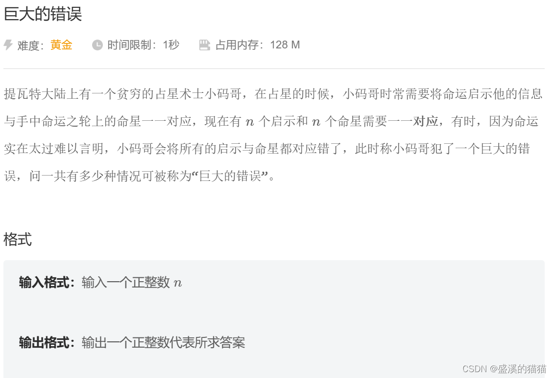 提瓦特大陆上有一个贫穷的占星术士小码哥,在占星的时候,小码哥时常需要将命运启示他的信息与手中命运之轮上的命星一一对应,现在有几个启示和几个命星需要一一对应,有时,因为命运实在太过难以言明,小码哥会将所有的启示与命星都对应错了,此时称小码哥犯了一个巨大的错误,问一共有多少种情况可被称为“巨大的错误”