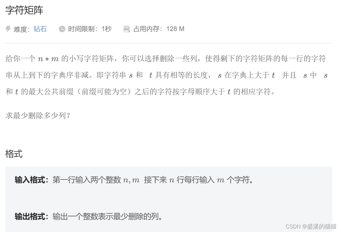 给你一个n*m 的小写字符矩阵,你可以选择删除一些列,使得剩下的字符矩阵的每一行的字符串从上到下的字典序非减。即字符串s和t具有相等的长度,s在字典上大于t并且s中8和t的最大公共前缀(前缀可能为空)之后的字符按字母顺序大于t的相应字符。