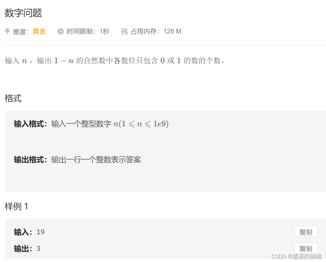输入n,输出1一n的自然数中各数位只包含0或1的数的个数。