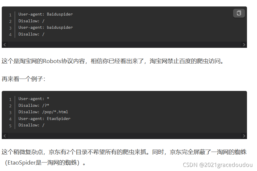 Allow 代表允许访问,Disallow 就是禁止访问,User-agent 可以判断是哪家爬虫