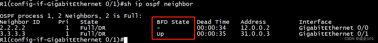 测试查看:在R1上执行sh ip ospf neighbor ,可以发现R1与R3建立的邻居关系BFD状态为UP,而与R2建立的邻居关系则无显示