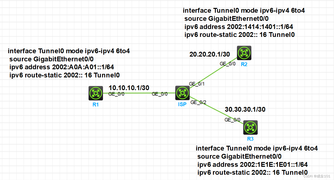 6to4隧道必须采用特殊的6to4地址,其格式为2002:abcd:efgh:子网号:∵:接口ID,其中2002表示固定的IPv6地址前缀,abcd:efgh为用16进制表示的IPv4地址(如1.1.1.1可以表示为0101:0101)R1与R2、R3建立6to4隧道。R1进行ping通测试。